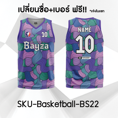 เสื้อบาสพิมพ์ลาย รุ่น BS22 จาก โรงงานเสื้อพิมพ์ลาย ฉีกกฎเดิมๆ ด้วยดีไซน์ลายพรางกราฟิก (Graphic Camo) โทนสีม่วง ตัดสลับกับสีฟ้าและเขียวมิ้นต์ ให้ความรู้สึกสนุกสนาน ขี้เล่น แต่ยังคงความเท่และโดดเด่นไม่ซ้ำใครในสนาม